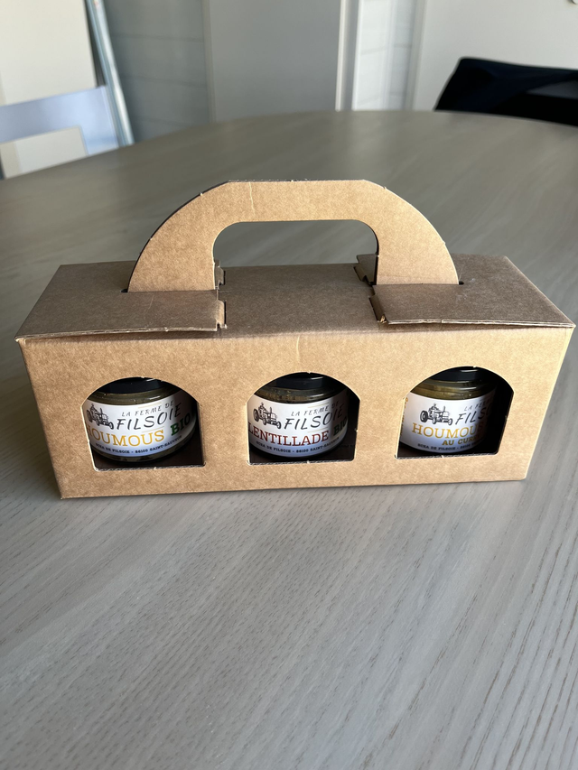Trilogie composée d'un houmous nature, d'une lentillade et d'un houmous au curry.